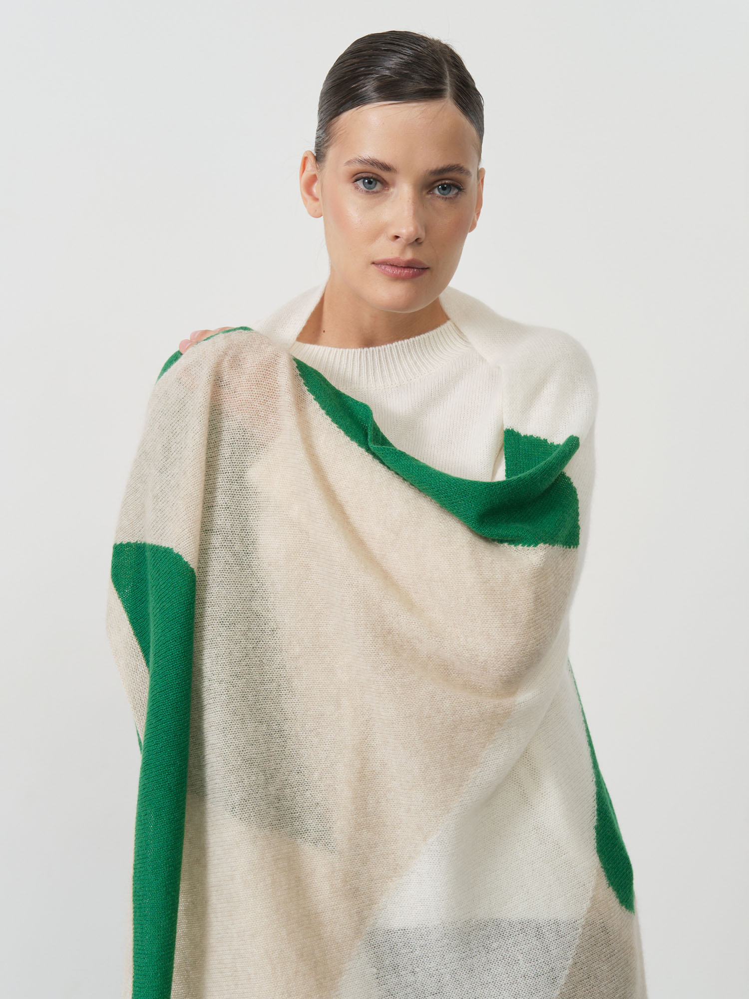 Свободная форма и крупные цветовые элементы создают выразительный графичный дизайн. Лёгкая и пластичная структура кашемира позволяет изделию красиво струиться и формировать мягкие складки.