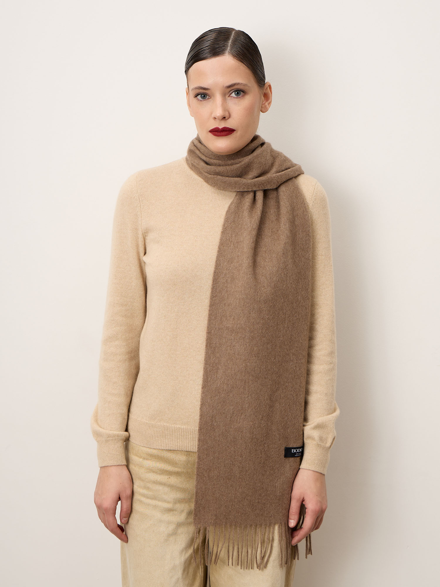 100% натуральный кашемир — лёгкий, тёплый и невероятно мягкий материал. Волокно обладает высокой теплоизоляцией, остаётся дышащим и комфортным для кожи. При правильном уходе сохраняет форму и презентабельный внешний вид.
