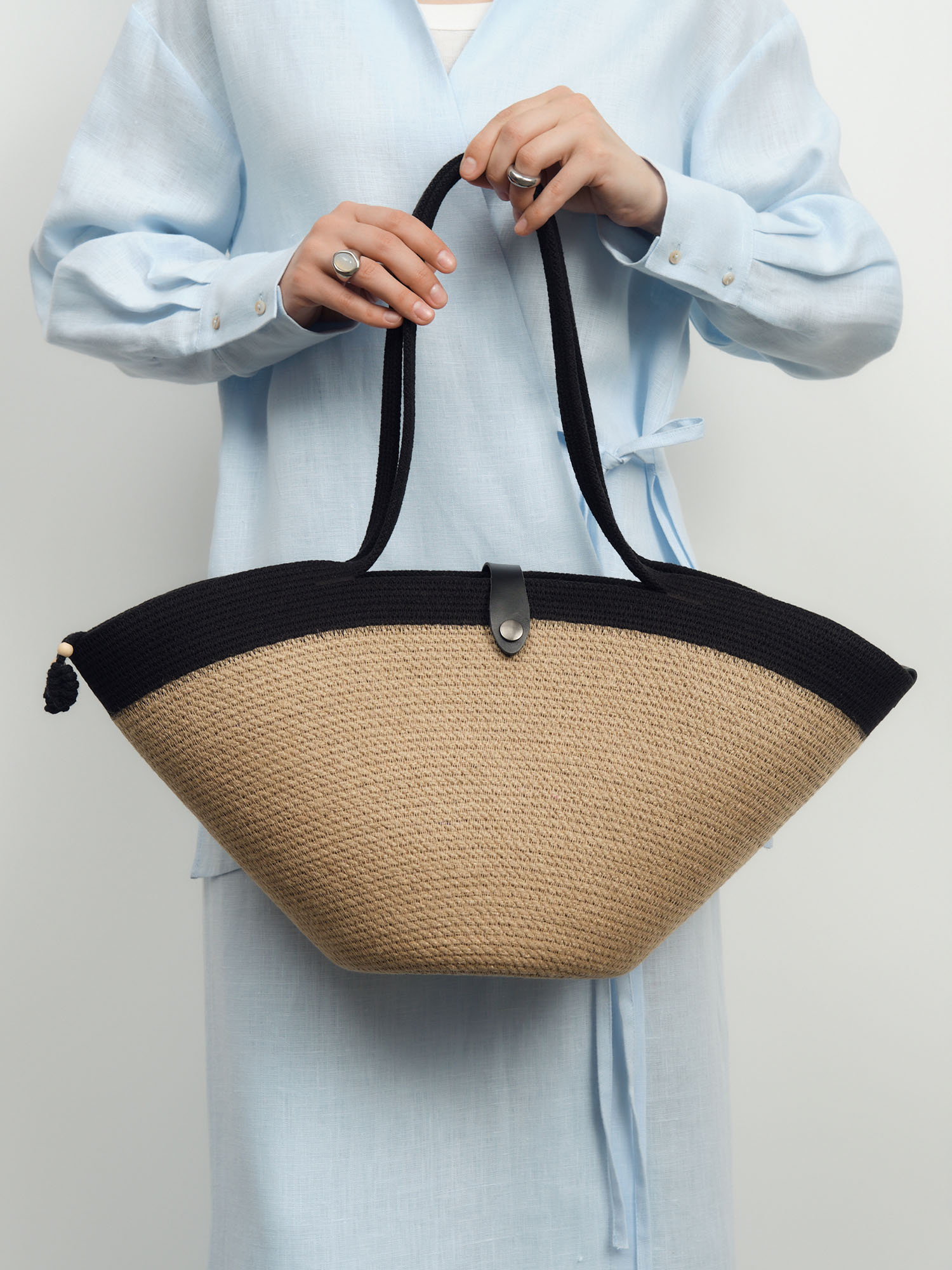 Минималистичная чёрная сумка из натурального джута – трендовый аксессуар для современных горожанок. Модель Alice сочетает в себе экологичность природных материалов и лаконичный городской шик.