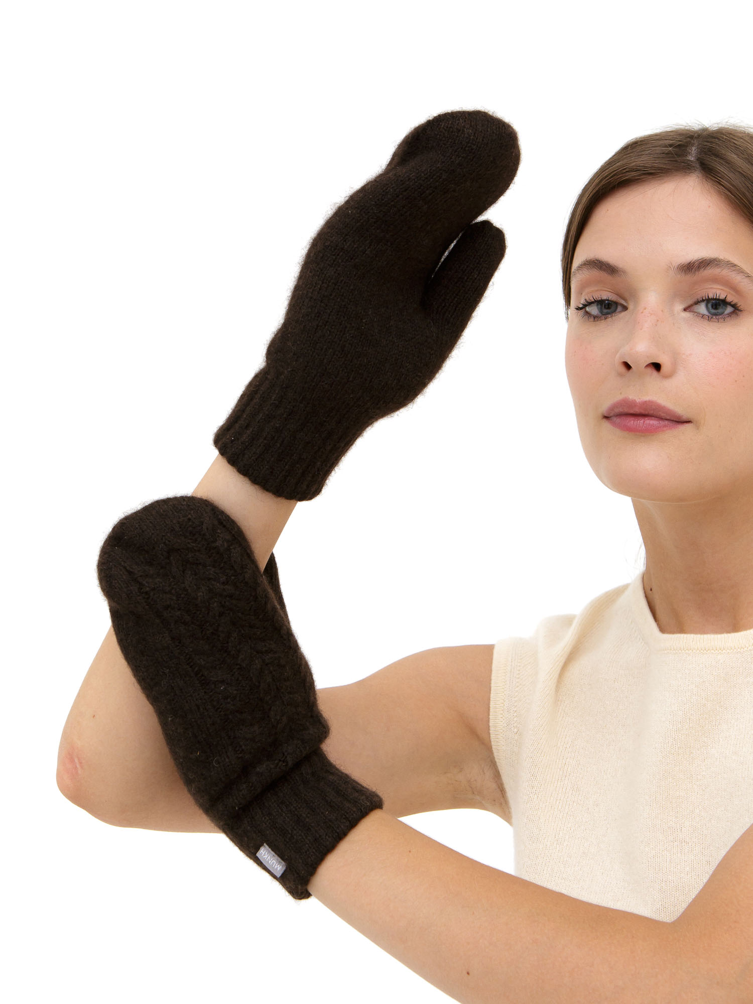 Главная особенность модели — выразительный плетёный узор, который придаёт варежкам объемную текстуру и премиальный внешний вид. Такой дизайн выглядит уютно и стильно, подчёркивая натуральность материала и добавляя глубину образу.