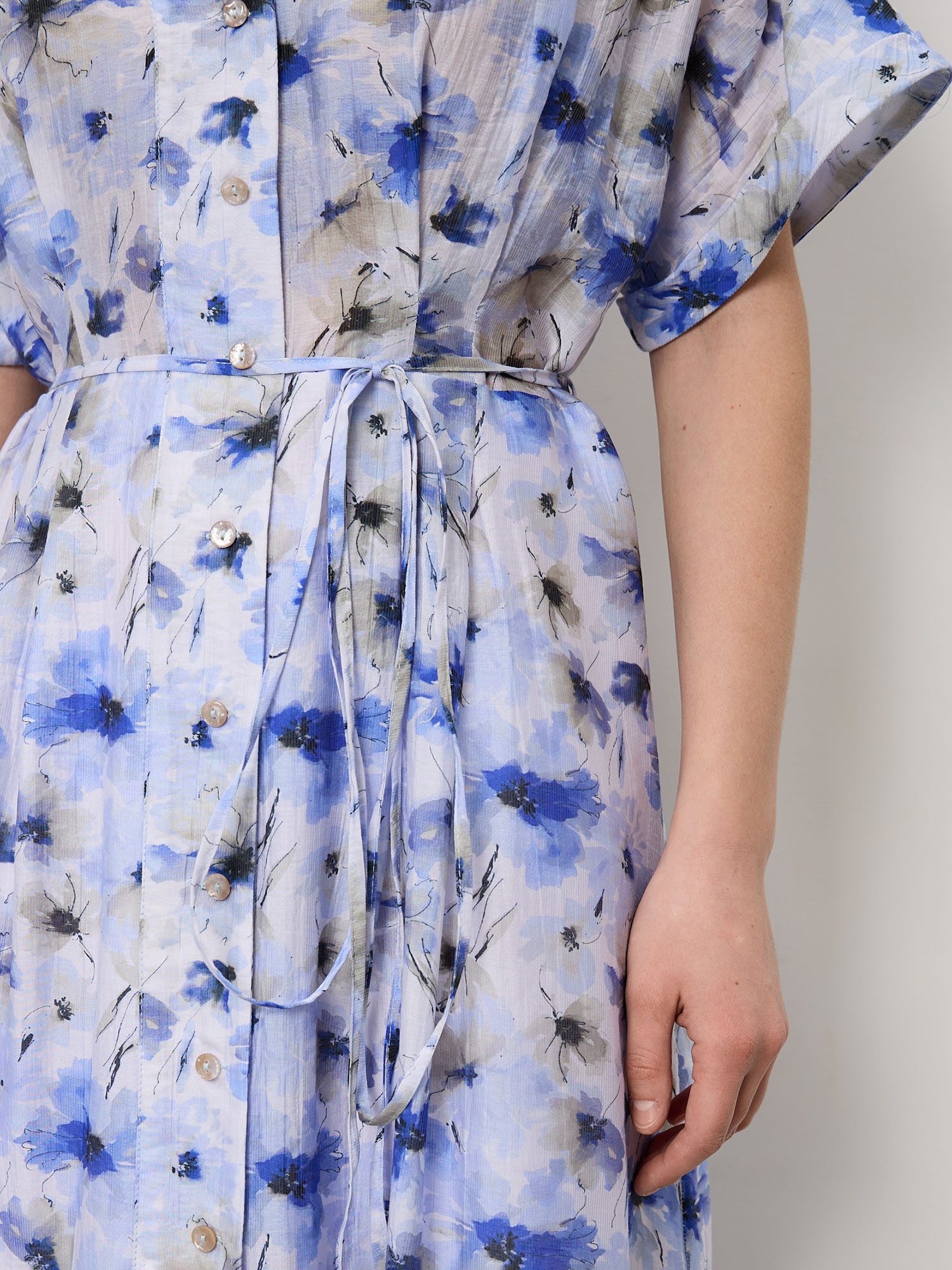 Модель выполнена с аккуратным воротником и застёжкой на пуговицы спереди. Короткие рукава и длина миди создают элегантный силуэт, а нежный цветочный принт делает образ более выразительным и женственным.