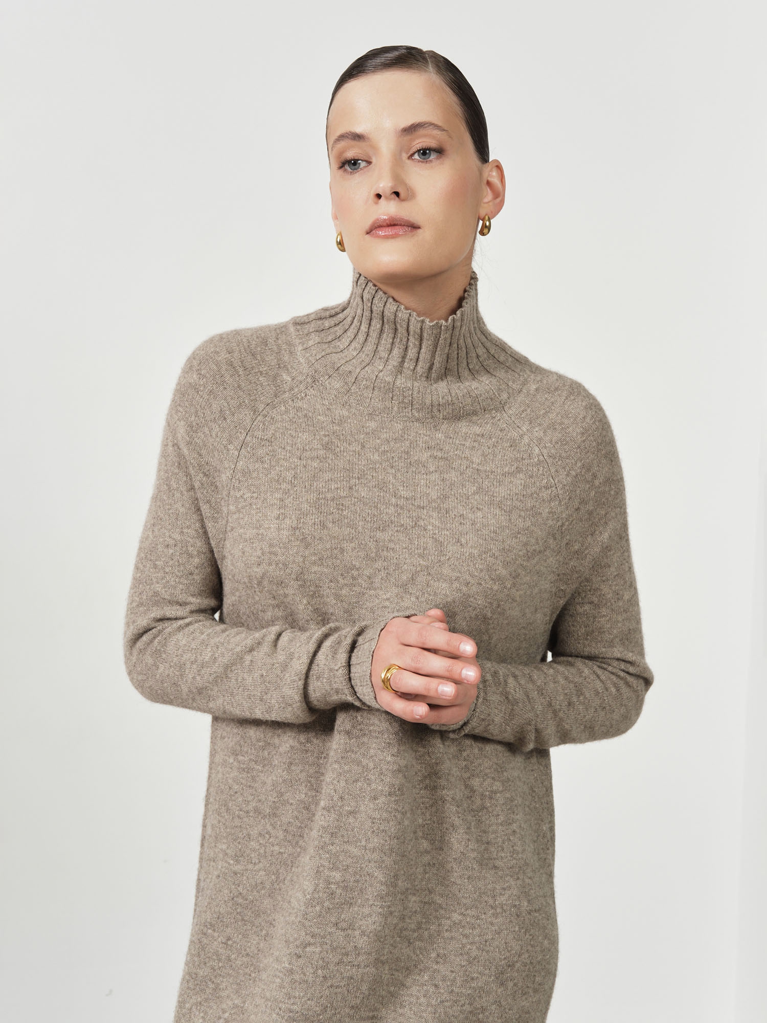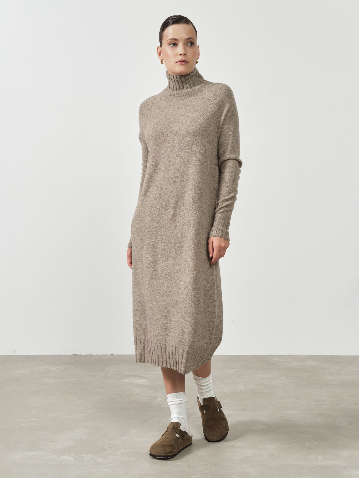 Длинные рукава и свободный крой создают ощущение уюта, а элегантный воротник стойка добавляет образу элегантности и защищает шею от холода. Цвет платья универсален и легко сочетается с разными элементами гардероба, позволяя создавать стильные и теплые образы на каждый день.