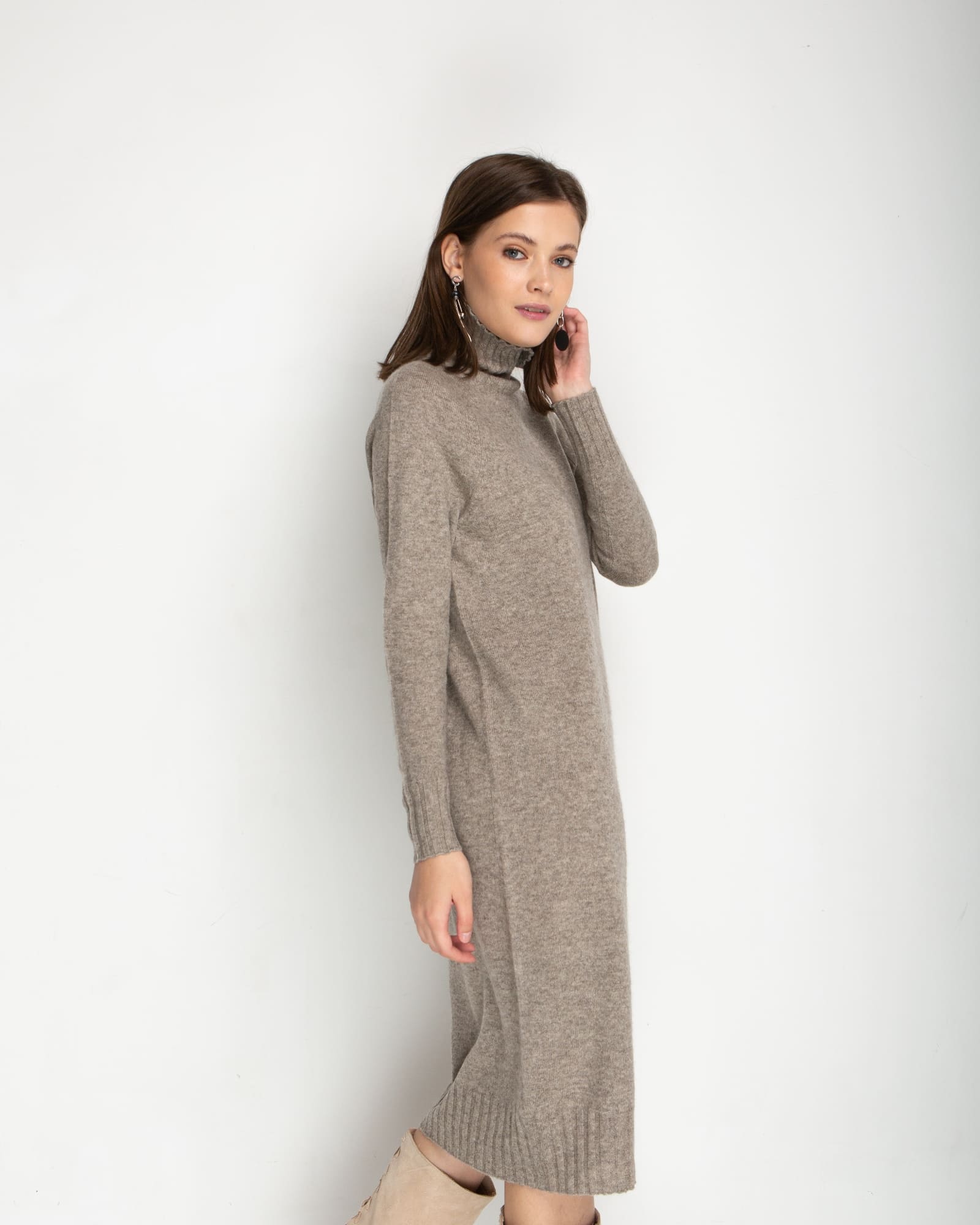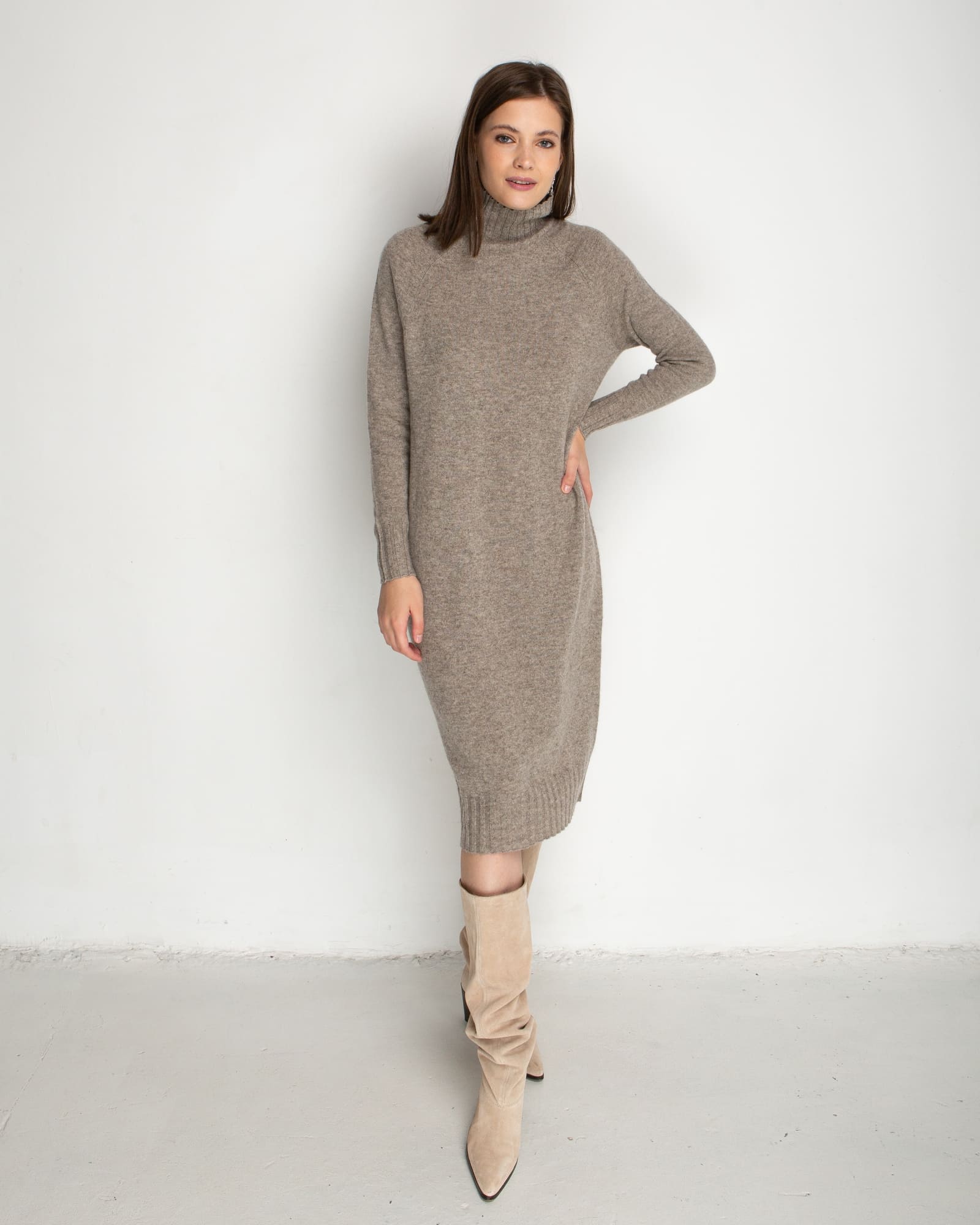 Платье из пуха яка с воротником стойкой в серо-бежевом цвете — это идеальный выбор для холодного времени года. Выполненное из натурального пуха яка, оно обладает исключительной мягкостью и способностью сохранять тепло, обеспечивая комфорт даже в самые морозные дни.